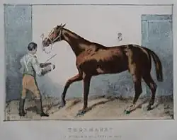 Thormanby stood as a stallion at Croft stud, near Darlington, Park Paddocks at Newmarket and the Moorlands stud near York.[8] He was a successful stallion, siring the 2000 Guineas winners Atlantic and Charibert and being the Champion sire of 1869. He is present in the pedigrees of almost all modern Thoroughbreds through his daughter, Rouge Rose, who produced the Derby Winner Bend Or.[17][18] Thormanby sired almost a hundred winners before dying suddenly at the age of eighteen in 1875.[1] Thormanby's tail was mounted and fashioned into a whisk which was hung in the hall of Mathew Dawson's Heath House at Newmarket.[19]