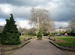 Originally Thornhill Square gardens were provided for the private use of the residents of the square, and in the early days were mainly better-off professional classes. The gardens were Islington's largest (though private) recreational space until Highbury Fields were acquired in the 1880s.[1]: 143 The railings enclosing the garden date from 1852, having survived removal in the Second World War when many garden squares lost their railings.[9] This was supposedly to provide scrap metal for munitions, but there is some scepticism as to whether they were actually used for this purpose.[10] Historical paint analysis of the railings has shown that when first installed, they were painted a patina green to mimic weathered bronze, a common theme of early Georgian architecture.