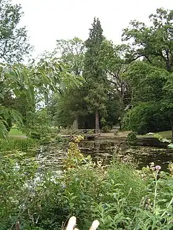 There is no surviving record of a village at Thorp Perrow.[2] A park called Thorpe Park went with the manor of Thorp Perrow in the 16th and 17th centuries.[1] Spring Wood was planted in the 16th century, and survives to this day.[3] Thorp Perrow Hall was built in the early 18th century.[4] Ornamental gardens and lakes were laid out around 1800, and a collection of exotic conifers called Milbank Pinetum was planted between 1840 and 1870 by Lady Augusta Milbank.[5]