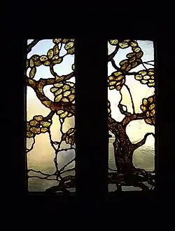 The entry hall of the Thorsen House is paneled in Burmese Teak while the living and dining rooms are paneled in Honduras Mahogany with square ebony plugs covering brass wood screws. The fireplace in the living room is surrounded in mauve tile from the Grueby Faience Company. The front door and side lights contain leaded art glass in the design of a gnarled grape vine, executed by Emil Lange, who created art-glass designs for several other Greene & Greene houses, including the Gamble House. Greene & Greene were also commissioned to design furniture for the Thorsen's dining room, and were also called back subsequently to design additional furniture, as well as modest additions and alterations to the house itself.