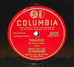 "Thoughtless" is a 1947 song by Doris Day with The Modernaires under the direction of George Siravo. The song was written by Carl G. Lampl, who wrote Sinatra's "Close to You", and Buddy Kaye. It was released on December 29, 1947 and went to #24 in the US charts.[1] The lyrics begin "You are so thoughtless of me".