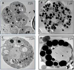 - ^ Simionato, Diana; Block, Maryse A.; La Rocca, Nicoletta; Jouhet, Juliette; Maréchal, Eric; Finazzi, Giovanni; Morosinotto, Tomas (2013). "The Response of Nannochloropsis gaditana to Nitrogen Starvation Includes De Novo Biosynthesis of Triacylglycerols, a Decrease of Chloroplast Galactolipids, and Reorganization of the Photosynthetic Apparatus". Eukaryotic Cell. 12 (5): 665–676. doi:10.1128/EC.00363-12. ISSN 1535-9778. PMC 3647774. PMID 23457191.