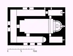 Externally, three-church basilicas look like a conventional three-aisled basilica, presenting a similar outline, with the high central section covered by a gable roof and the lower side sections, each covered by a mono-pitched roof.[2] However, unlike a conventional three-aisled basilica—terminating in a sanctuary on the east and possessing north and south aisles—a three-church basilica was designed so that there was either no direct communication between the central nave and the side aisles except through a narthex at the west end or, alternatively, they were only accessed through one door from the central nave into the auxiliary space formed by the aisles. The aisles were commonly semi-open due to the central sections of the north and south exterior walls being replaced by an arched arcade.[1]