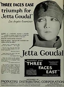 Three Faces East is a 1926 American silent drama film directed by Rupert Julian and starring Jetta Goudal and Clive Brook. It is based on a popular 1918 Broadway play by Anthony Paul Kelly about spies during World War I.[1] It was remade under same title as a sound film in 1930,[2][3] and in 1940 under the title British Intelligence starring Boris Karloff. The story's action takes place in France and Great Britain.