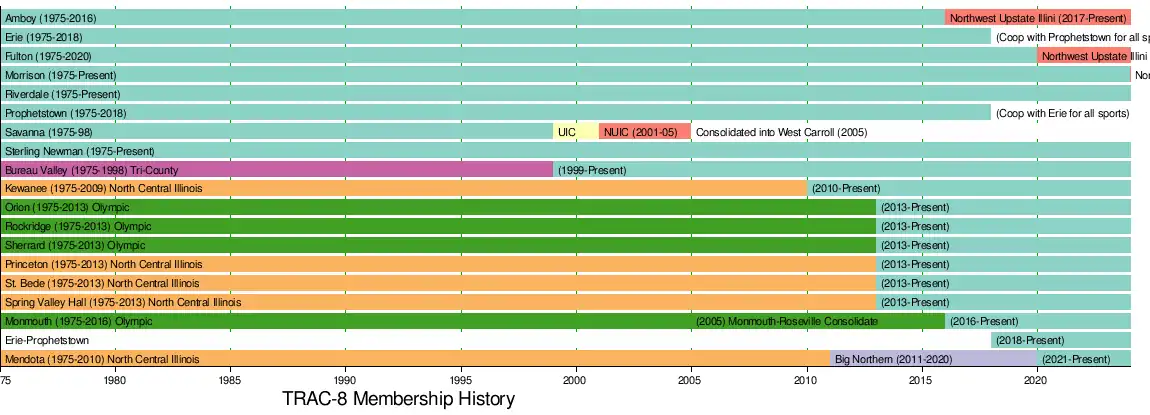 Prior to the development of the TRAC-8, the IHSA was pushing teams to end multi-state conferences. Therefore, Fulton, Morrison, Riverdale, Savanna and Newman came from the dissolved Illowa Conference, Amboy left the Wisconsin-Illinois SHARK Conference and Erie and Prophetstown, then competing as individual high schools, left the Iowa-Illinois Pleasant Valley Conference.