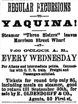 Three Sisters would then depart Portland for Albany on Wednesdays and Saturdays at 7:00 a.m., arriving in Albany on Thursdays and Saturdays at 12 noon.[6] In July 1887, the Oregon Pacific Railroad was advertising excursions, on a route including the steamboat Three Sisters, to Yaquina Bay, then undergoing development as a resort area.[7] Three Sisters would depart every Wednesday at 7:00 a.m. from the Morrison Street wharf, for Albany and intermediate points.[7] Round-trip tickets, good until September 20, 1887, cost $6, and included meals on the steamer.[7] E. Oldendorff & Co. was the ticketing agent.[7]