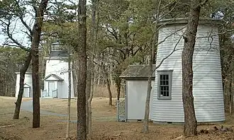 The Three Sisters of Nauset are a trio of historic lighthouses off Cable Road in Eastham, Massachusetts. The original three brick towers fell into the sea due to erosion in 1890 and were replaced with wooden towers on brick foundations in 1892. The Sisters were decommissioned in 1911 but one of them, the Beacon, was moved back from the shoreline and attached to the keeper's house. It continued to operate but was replaced by a new steel tower, the Nauset Light, in 1923.[2] [3]