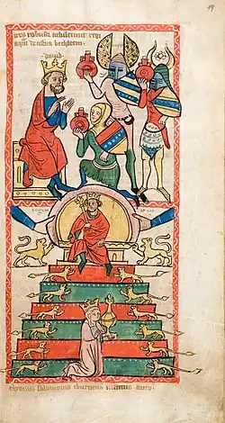 A Jewish tradition holds that the throne was removed to Babylon, then Ahasuerus sat on the throne of Solomon.[1] Another tradition holds that six steps related to six terms for the earth.[2][3] According to the Targum Sheni of Megillat Esther, Solomon's throne was one of the earliest mechanical devices invented, with movable parts. When it was transferred to Persia some centuries later and used in the palace of Ahasuerus, it ceased to work. It has been described as a throne overlaid with gold, and studded with jewels; emeralds, cat's eye, the Baghdadi onyx, pearls and marble. It was ascended by many steps, the sides of which were aligned with twelve sculptured lions of gold, before whom were golden sculptures of eagles, the right paw of each lion set opposite the left wing of each eagle. As one approached the top of the staircase, there were another six steps directly in front of the semi-circular throne, each step with a pair of sculpted animals, each in gold; the first step having a couching bull opposite a lion; the second a wolf on its haunches opposite a sheep; the third a panther opposite a camel; the fourth an eagle opposite a peacock; the fifth a wildcat opposite a cock; the sixth a hawk opposite a pigeon. Above the throne was a seven-branched candlestick which afforded light, each branch bearing a sculpted image of the seven patriarchs: Adam (the first man), Noah, Shem, Abraham, Isaac, Jacob, and Job among them.