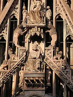 The Throne of Charlemagne, or Royal Throne at Aachen (Aachener Königsthron) is a throne erected in the 790s by Charlemagne, as one of the fittings of his palatine chapel in Aachen. Until 1531, it served as the throne of the coronation of the Holy Roman Emperors and the King of the Romans, being used at a total of thirty-one coronations. As a result, especially in the eleventh century, it was referred to as the totius regni archisolum ("Archstool of the Whole Realm").[6] Charlemagne himself was not crowned on this throne, but instead in the Old St. Peter's Basilica in Rome by Pope Leo III. The throne was modeled after the throne of Solomon.