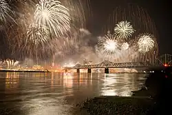 Thunder generally starts in the afternoon with an air show, followed by the fireworks show starting at 9:30 pm, along with a synchronized soundtrack through PA and radio. An average of 625,000 people have attended each year since 1997, lining the banks of the Ohio River in Louisville, and across the river in Jeffersonville and Clarksville, Indiana. Some also watch from the river on boats, docked in positions auctioned off for charity.[3] Eight 400-foot barges launch the fireworks, provided by Zambelli Fireworks Internationale, from both sides of the George Rogers Clark Memorial Bridge, and more fireworks are launched from the bridge itself.