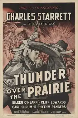 Thunder Over the Prairie is a 1941 American western film directed by Lambert Hillyer and written by Betty Burbridge. It is based on the 1935 novel The Medico Rides by James L. Rubel. The film stars Charles Starrett, Cliff Edwards, Eileen O'Hearn, Stanley Brown, Danny Mummert and David Sharpe. The film was released on July 30, 1941, by Columbia Pictures.[1][2][3] It is a sequel to The Medico of Painted Springs, released a month earlier. The third "Medico" film, Prairie Stranger, debuted in September.[4]