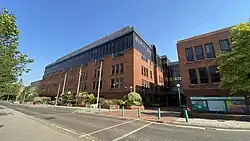 The council is based at Thurrock Town Hall on New Road in Grays.[58] When the council was created in 1974 it used the former offices of the Thurrock Urban District Council in a converted house called Farley and adjoining buildings around the junction of Whitehall Lane and Palmers Avenue in Grays.[59] In 1986 the council built itself a new headquarters at the corner of New Road and Derby Bridge Road in the centre of Grays.[60] The building has subsequently been extended westward along New Road with a large central block added in 1992 and a new wing at the corner of New Road and High Street completed in 2022.[61][62]
