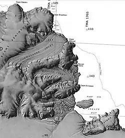 The northwest side of the island consists of a series of capes, peninsulas and inlets. From west to east they include Cape Flying Fish, Cape Petersen, Williams Island, Jones Peninsula, Dyer Point, Cape Davies, Hughes Peninsula, Henry Inlet, Tinglof Peninsula, Wagoner Inlet, Starr Peninsula, Potaka Inlet, Kearns Peninsula, Peale Inlet, Glacier Bight, Noville Peninsula, Porters Pinnacles and Mount Palmer.[2] Features of the north of the island include Sikorski Glacier, Mount Feury, Frankenfield Glacier, Mulroy Island, Black Crag, Pelter Glacier, Murphy Inlet, Linsley Peninsula, Ball Peninsula, Edwards Peninsula, Mount Bubier, Koether Inlet, Evans Peninsula, Cape Walden and Cape Braathen.[2]