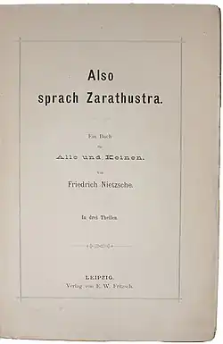 Thus Spoke Zarathustra: A Book for All and None (German: Also sprach Zarathustra: Ein Buch für Alle und Keinen), also translated as Thus Spake Zarathustra, is a work of philosophical fiction written by German philosopher Friedrich Nietzsche. It was published in four volumes between 1883 and 1885. The protagonist is nominally the historical Zarathustra, more commonly called Zoroaster in the West.