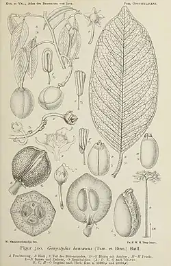 Gonystylus bancanus native to Brunei, Indonesia, and Malaysia: botanical line drawing of detailed anatomy