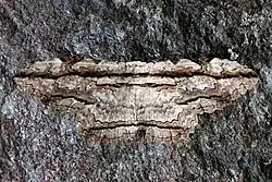 Upperside: Antennae setaceous and dark brown. Head the same. Thorax and abdomen grey: having a tuft of black hairs standing between them. General colour grey, faintly tinged with red. Anterior wings with a remarkable irregular black bar running from the tips to the shoulders, crossing the thorax horizontally, and parallel with the anterior edges; on the middle of this edge is a triangular dark brown spot edged with black, and nearer the body is a smaller one of the same shape and colour: a second narrower black line is situate about half an inch below, and parallel with the first, rising on the posterior edges, and extending across the wings almost to the external ones. Posterior wings with a black irregular bar arising near the external corners, and crossing them in a straight direction, meeting at the extremity of the abdomen; just above this, and almost close to it, is a very small and narrow waved black line running parallel with it, but towards the end suddenly turns off, and reaches the anterior edges. Besides the above markings there are a number of lighter and darker shades interspersed on the different parts of the wings.