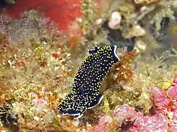 Thysanozoon nigropapillosum is a species of polyclad flatworms belonging to the family Pseudocerotidae. Some common names include Gold-speckled flatworm, Marine flatworm, Yellow papillae flatworm, Yellow-spotted flatworm, and Yellow-spotted polyclad flatworm.
