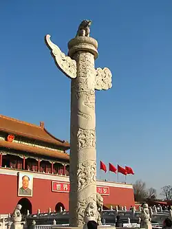 Two stone columns, called huabiao, each with an animal (hou) on top of it, also stand in front of the gate. Originally, these installations were designed for commoners to address their grievances by either writing or sticking petitions on the columns. However, the examples in front of the Imperial City were purely decorative, and instead connoted the majesty of the imperial government.