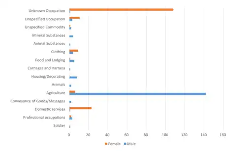 According to the 1881 census, females were involved in a number of occupations, for example being largely involved in domestic services compared to men. Domestic services include domestic indoor servants and washing and bathing services. However, a large majority of women were registered with an "unknown occupation".