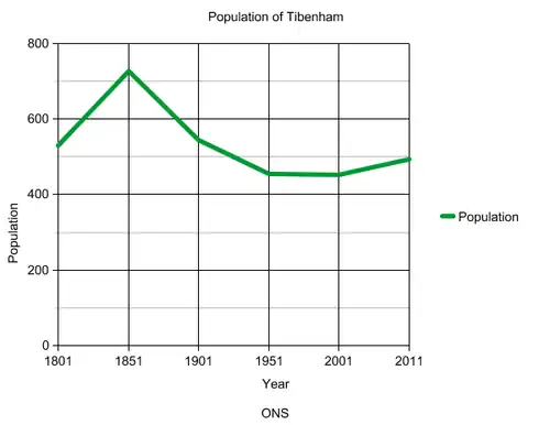 According to archived census data, in 1881 the population of the village was 707.[8] With the southward shift in industry within the country, as well as a shift in career opportunities, it can be seen that Tibenham has since seen a decline in population with the 2011 census totalling 494.