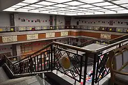 The museum is a multimillion-dollar project.[4] It is located in an L-shaped building situated directly below the Potala Palace on the corner of Norbulingkha Road. The modern museum building fuses together traditional Tibetan architecture with the modern.[5] It is a grey brick building with dark brown and white roof furnishings with a golden orange gilded roof. The museum is structured into three main sections: a main exhibition hall, a folk cultural garden and an administrative quarter.[1] The central courtyard to the museum is uniquely designed, with a white, sleek-looking floor, and draws upon traditional monastic conventions. It features an origin, black and white design in the centre and has lighting through large skylight windows above. The museum covers an area of 53,959 square meters, with a total construction area of 23,508 square meters.[1]