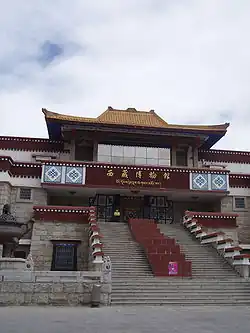 The Tibet Museum (Tibetan: བོད་ལྗྗོངས་རྟེན་རྫས་བཤམས་མཛོད་ཁང་ Chinese: 西藏博物馆) is the official museum of the Tibet Autonomous Region of China in Lhasa. Inaugurated on October 5, 1999, it is the first large, modern museum in the Tibet Autonomous Region.[1] It has a collection of more than 520,000 artifacts, including pottery, jade, and Buddha statues, attracting hundreds of thousands of visitors every year.[2] It has a collection of around 1,000 artifacts permanently on display related to the cultural history of Tibet, from examples of Tibetan art to architectural design throughout history such as Tibetan doors and beams. In order to fill the museum the Tibet aristocracy and religious establishment had their property confiscated by the Chinese Government (Harris 2013:67).[3]