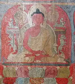 Most Tibetan Buddhist monasteries, temples and other religious structures in the Himalayas were decorated with Tibetan Buddhist wall paintings. Despite much destruction in Tibet itself, many of these survive, the dry climate of the Tibetan plateau assisting their survival, as the wet Indian climate has reduced survival of paintings from there. There are some regional differences, but the techniques described here cover the traditional wall paintings across this area. The wall paintings were executed on earthen plaster with the secco-technique.[1] A secco-technique is a painting technique in which the pigments with their binder are employed to paint onto a dry (Italian: secco) wall.[2]