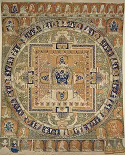 Narrative depictions of the lives of religious figures are found in thangkas, usually with the various events shown around a much larger central figure. The life of Gautama Buddha is depicted,[56] as well as his previous lives,[57] but the other most important buddhas and bodhisattvas generally lack biographies. Tibetan figures such as Padmasambhava,[58] Milarepa,[59] and famous monks such as Sakya Pandita,[60] and the Third Dalai Lama may be treated in a similar style.[61] From the 18th century these scenes may be placed in a detailed landscape drawing on Chinese styles.[62] Another style has a main central figure with much smaller portraits around the edge of the composition, either in compartments or in later examples in a landscape setting. These may be divine figures, or monks who were mentors or pupils.[63]
