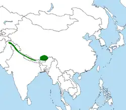 The Tibetan blackbird is found locally in the Himalayas of India, Pakistan, Nepal, Bhutan, and China. During the breeding season, it inhabits steep grassy, rocky slopes and alpine meadows just above the tree line at elevations of 3,200–4,800 m (10,500–15,700 ft). In the winter, it descends to lower elevations, but rarely goes below 3,000 m (9,800 ft).[11]