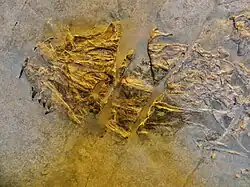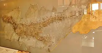 One of only a handful of fossil reptiles that have been found in Switzerland, Ticinosuchus (meaning "Ticino crocodile" due to its origin from the Swiss canton Ticino) was about 3 metres (10 ft) long, and its whole body, even the belly, was covered in thick, armoured scutes. These scutes were sometimes considered to have been staggered, alternating between several rows.[2] However, some studies refute this claim, instead purporting that the scutes were aligned in neat rows, with a one-to-one assignment of scutes to vertebrae.[3] The structure of the hips shows that its legs were placed under the body almost vertically. Coupled with the development of a calcaneus and a specialized ankle joint, this would have made Ticinosuchus a fast runner, unlike most earlier reptiles.[4] Ticinosuchus is thought to be very close to or possible even the same species that made the Cheirotherium trace fossils found in Germany. It too shows a narrow track-way, similar to that of Ticinosuchus. It is one of the most famous fossils of Besano.[5]