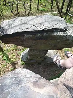 Ticklish Rock is an unusual sandstone rock formation, located in Shrewsbury Township, Sullivan County, Pennsylvania. The brown and green sandstone formation, which stands at the edge of a steep cliff and resembles an upright hammer. It consists of a large horizontal block, 3 feet high, 8 feet long, and 6 feet wide (0.9 x 2.4 x 1.8 m), balanced upon a thin, 18 in × 30 in (46 cm × 76 cm) pedestal.