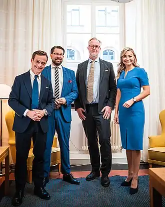 ![]() Party leaders Ulf Kristersson, Jimmie Åkesson, Johan Pehrson and Ebba Busch gathered before the press conference where the Tidö Agreement was presented | |