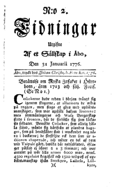 Tidningar Utgifne Af et Sällskap i Åbo was a newspaper that was first published in Finland in 1771, the first newspaper to be published in Finland. Finland was under Swedish rule at that time, and the newspaper was published in the Swedish language. It was in circulation until 1785.[1][2]