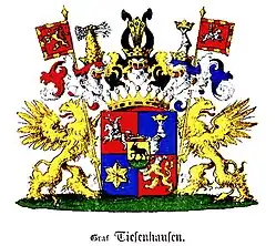 The House of Tiesenhausen is an old Baltic-German noble family. The origins of the family are in Lower Saxony. During the Baltic crusades they settled in Livonia in the first half of the 13th century. Bishops Albert of Riga and Herman of Tartu had a sister whose husband Engelbertus de Tisenhuse was the progenitor of the family in the Baltic. After some time in southern Livonia in the early stages of occupation, Engelbertus joined his brother-in-law bishop Herman to obtain the northern Livonian country of Ugaunia around Otepää and Tartu. It was Ugaunia where the family held its main early properties and positions. Engelbertus' son married a daughter of the castellan of Koknese in Latgale and through this marriage, the family claims descent from indigenous princes of the Latgalians. Some branches of Tisenhusen clan settled later to the Latvian Vidzeme holdings of Ērgļi and Bērzaune. From the ancestral place of Ugaunia, sons of the family managed to obtain estates in other parts of Estonia, also so-called Danish Estonia and Osilia-Rotalia, both by services and by marriages. (Raplamaa was apparently a favorite place in northern Estonia for them to obtain estates.)