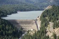 Tieton Dam is an earth and concrete type dam on the Tieton River in Yakima County, in the U.S. state of Washington. The dam began operation in 1925. Its reservoir, Rimrock Lake, has a total capacity of 203,600 acre-feet (0.2511 km3) with a normal operating capacity of 198,000 acre-feet (0.244 km3) to provides water for agricultural irrigation.[1] This dam is a component of the Yakima Project.[2] Tieton Dam also produces electricity for Burbank Water and Power and Glendale Water and Power, near Los Angeles. The Southern California Public Power Agency installed two 7 megawatt generators in a project started in 2010. The power is transmitted over the Pacific DC Intertie that runs from Celilo, Oregon to Sylmar, California.[3][2] Upstream from the dam, the river is impounded by Clear Creek Dam, another element of the Yakima Project. About 8 miles (13 km) downstream from the dam, the Tieton River is tapped for the Tieton Main Canal.