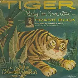 Tiger, a children’s record, was Frank Buck’s last recorded performance. The story was adapted by "Peter Steele" and Hecky Krasnow. In fact, Krasnow often wrote under two names, Peter Steele and Hecky Krasno, dropping the "w."[1] In Tiger Krasnow combined two animals from two stories in Bring 'Em Back Alive: