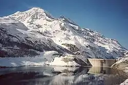 The Tignes Dam, also known as the Chevril Dam, is an arch dam on the Isère in the municipality of Tignes in the Rhône-Alpes region in south-eastern France. In planning since the 1920s and under the protest of locals, the dam was constructed between 1948 and 1952 with the purpose of hydroelectric power. At the time of its completion, it was the tallest dam in Europe. Water from the dam's reservoir, Lac du Chevril, feeds two power stations, the 96 MW Brevieres Power Station and the 332 MW Malgovert Power Station, for a total installed capacity of 428 MW. The yearly average combined output of the two power stations is 94 MW.[2] Brevieres is located about 1 km (0.62 mi) downstream of the dam and Malgovert is also located downstream, 17 km (11 mi) to the northwest at 45°37′04.28″N 6°47′25.31″E / 45.6178556°N 6.7903639°E. The dam was designed by Coyne & Bellier and is currently owned and operated by Électricité de France.[3] Lac du Chevril flooded the town of Tignes which was relocated nearby.