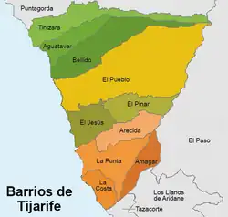 Tijarafe is a town and a municipality on the island of La Palma, Province of Santa Cruz de Tenerife, Canary Islands, Spain. It is situated in the northwestern part of the island. The population of the municipality is 2,776 (2013)[3] and the area is 53.76 km².[1] Tijarafe is 7 km northwest of Los Llanos de Aridane and 19 km west of the island capital Santa Cruz de La Palma.