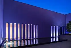 The building's design is the work of the late Mexican architect Ricardo Legorreta. Its central courtyard, functioning as the primary circulation node, is a purple patio with an ash tree and a reflecting pool, referencing vernacular Mexican architecture.[31] The arrivals hall features car rental facilities, bus agencies, and a snack bar.[35][36]