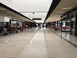 The first floor houses the main hall, which features a security checkpoint and an airside corridor leading to Concourses A and B. This zone is equipped with food outlets, a duty-free store, and a VIP lounge.[28] The gates are located in two piers, designated A and B, which are connected to the main terminal. It is designed so that international flights can be handled at Concourse B and domestic flights at both concourses. Additionally, gates 19 and 20 are located at the east end of the terminal, where passengers board their aircraft directly from the apron.