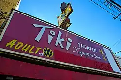 The Tiki Adult Theater, at one time signed as the Tiki Theater Xymposium, is an adult theater in Los Angeles, California, located on Santa Monica Boulevard. As of 2021, it was the last remaining adult theater in Los Angeles.[1][2] It was formerly part of the Pussycat Theater chain of pornographic movie theaters.[3] As of 2017, it was open 24 hours a day, with a ticket buying 4 hours admission.[4] The theater’s sign was also used as an in-game texture in Grand Theft Auto: San Andreas.[5]