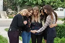 ![]() The Liars saying a brief goodbye to each other during the episode's final moments. From left to right: Alison, Aria, Hanna, Emily and Spencer. | |