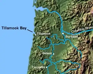 Tillamook Bay is a small inlet of the Pacific Ocean, approximately 6 mi (10 km) long and 2 mi (3 km) wide, on the northwest coast of the U.S. state of Oregon. It is located just north of Cape Meares in western Tillamook County approximately 75 mi (120 km) west of Portland.