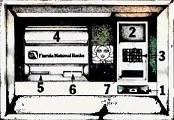 Tillie the All-Time Teller machines were red and gold to make them look more attractive.[2] On the bottom left was the place to enter an "access card," which featured a cartoon character.[2] Above that was a place to enter a "secret code" that the customer chose.[2] On the bottom center was a picture of a cartoon blonde girl with china-blue eyes[1] and a red hat. Above that was the place it handed out cash and coins. On the top right was the place to enter a desired amount of money.