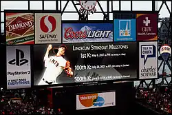 On May 4, 2011, Lincecum struck out twelve New York Mets, becoming the Giants franchise record holder for most games pitched with 10 or more strikeouts. Lincecum's total of 29 such games surpassed Hall of Fame "first five" inaugural member Christy Mathewson. While Mathewson accumulated his 28 ten-plus-strikeout games in 551 starts over 17 seasons with the Giants, Lincecum recorded 29 such games in 129 starts over five seasons.[79] On May 21, he threw a three-hit shutout against the Oakland Athletics as San Francisco won 3–0.[80] On June 6 at AT&T Park, Lincecum struck out Washington Nationals third baseman Jerry Hairston Jr. swinging to end the top of the second inning for his 1,000th career strikeout, becoming the fastest Giants pitcher in franchise history to reach the milestone. Lincecum was met with a large standing ovation from his loving fans as he came off of the mound and was congratulated by his coaches and teammates as he walked down into the dugout.[81][82]