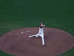 Lincecum threw a four-seam fastball, but mostly used a two-seam fastball which he threw for more sinking movement to get more ground balls. This pitch had little lateral movement due to his overhand delivery and the speed at which the pitch was thrown. He had a curveball which broke away from right-handed hitters.[144] These were his primary pitches when he first reached the major leagues, but as his career progressed, he added two more.[145] In 2007, he added a changeup with a grip similar to that of a split-finger fastball.[144][145] A fast pitch, his changeup appeared similar to his fastball for the first 30 feet (9.1 m), but then dove down sharply and tailed away from left-handed batters.[144][146][145] The changeup was his favorite pitch to throw with two strikes.[145] He had thrown a slider in college, and he started using it again in 2008, throwing it far more often by 2011.[146][145] The slider was a pitch he used when ahead in the count, as he preferred to rely on his fastball when he was behind.[145] He reached 99 mph (159 km/h) with his fastball in rookie year.[147] The fastball averaged 94.1 miles per hour (151.4 km/h) in 2008 and 92.4 miles per hour (148.7 km/h) in 2009, but by 2014 it was averaging less than 90 miles per hour (140 km/h).[144][86][148] His other pitches were typically in the high-70/low-80 mph range (approximately 128.75 km/h); these also slowed slightly as his career progressed.[144]