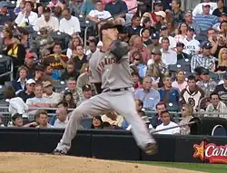 Lincecum made his professional debut in 2006 with the Salem-Keizer Volcanoes of the Single-A short season Northwest League.[17] Going into 2007, he was ranked as the #11 prospect in baseball and the #1 prospect in the San Francisco Giants organization by Baseball America.[18] In the spring of 2007, Colorado Rockies prospect Ian Stewart described Lincecum as tough to face, saying "You can't see the ball at all until it's right on top of you. It gets on you real quick...Guys on our club who have been in the big leagues said he's the toughest guy they ever faced too."[19] Lincecum spent the first month of the season pitching for the Fresno Grizzlies, the Giants' Triple-A affiliate in the Pacific Coast League (PCL). In 31 innings across five starts with the Grizzlies, he allowed just one run, 12 hits, and 11 walks while striking out 46 batters and going 4–0.[20] During his 2006 and 2007 minor league campaigns, Lincecum struck out 30.9% of batters, the highest ratio of any minor league pitcher in the previous ten years.[21]
