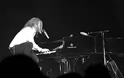 He draws on his background in theatre for his distinctive onstage appearance and persona.[9] In his performances, he typically goes barefoot with wild hair and heavy eye makeup, which is juxtaposed with a crisp suit and tails, and a grand piano. According to Minchin, he likes going barefoot in his shows because it makes him feel more comfortable. He considers the eye makeup important because while he is playing the piano he is not able to use his arms and relies on his face for expressions and gestures; the eyeliner makes his features more distinguishable for the audience.[11] He has said that much of his look and persona is about "treading that line between mocking yourself and wanting to be an iconic figure. Mocking the ridiculousness and completely unrealistic dream of being an iconic figure."[15]