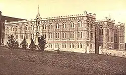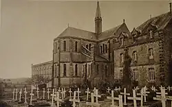 Construction of the priory and its buildings took place from 1842 to 1846, using materials from the ruins of Rohan Castle.[6] The church's foundation stone was laid on 1 April 1842, and it was consecrated on 1 September 1846. In 1847, a papal rescript elevated the priory to abbey status, naming it Notre-Dame de Thymadeuc. The conventual buildings were completed in 1860, though the cloister remained unfinished.[4]