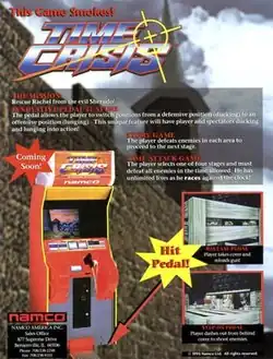Time Crisis is a 1995 light-gun shooter video game developed and published by Namco for arcades. It is the first installment in the Time Crisis series. The game differentiated itself from other light gun shooters of the time by incorporating a pedal that controls when the player character takes cover to reload and avoid enemy fire. Players have a limited amount of time to clear each section by defeating enemies. The game's story focuses on Richard Miller, an intelligence agent, who is ordered by his superiors to rescue an abducted woman from a vicious tyrant seeking to reclaim control of their former country from their homeland's new government.